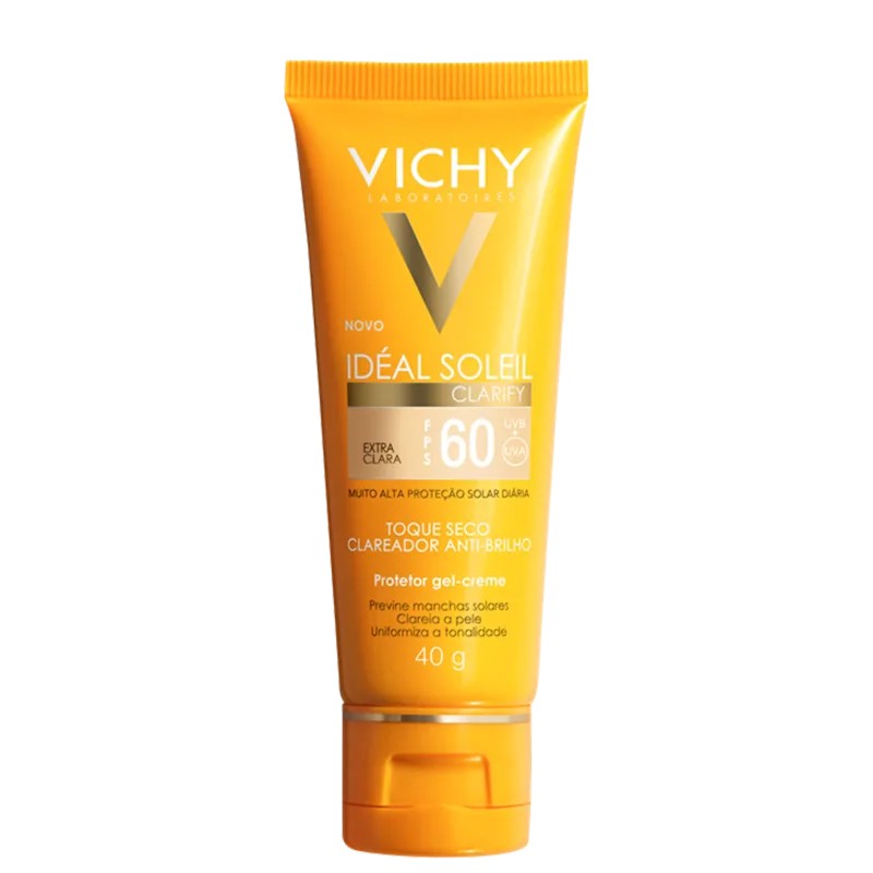 Protetor solar facial com cor. Vichy Idéal Soleil Clarify FPS 60 traz fórmula multifuncional: alta proteção solar, reduz e previne as marcas de envelhecimento solar, matifica e uniformiza o tom da pele com alta cobertura.